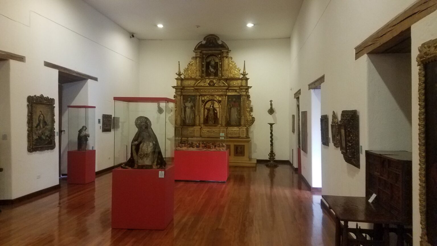 The museum houses a significant collection of art distributed in themed rooms. The 16th-century room exhibits paintings by Sánchez Gallque and sculptures by Diego de Robles; the 17th-century room highlights works by Miguel de Santiago y Goríbar; and the 18th-century rooms feature Caspicara, Legarda, and Samaniego. It also features a Miniatures Room with reliquaries, medallions, and ivory and tagua sculptures. Throughout its history, the museum has had renowned artists and cultural leaders from the country as directors.