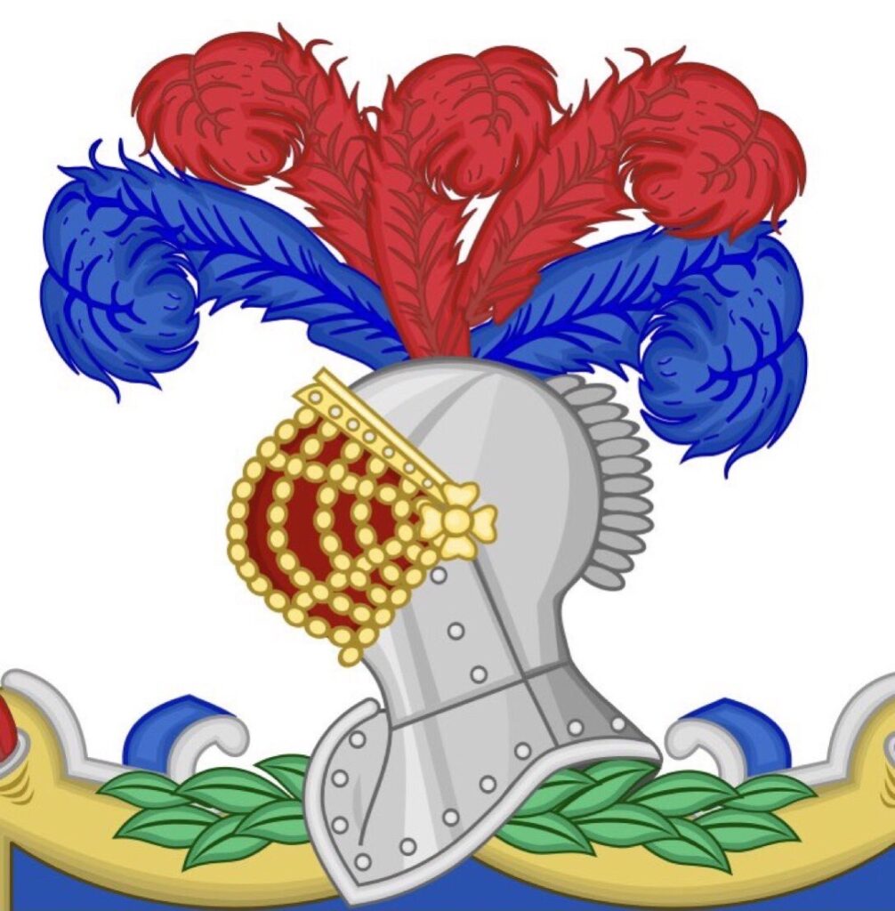 The border is a gold cord of St. Francis on a blue field. Crest: Gules and azure feathers. Helmet: Gold adorned with herons. Crest: Helmet with feathers, facing right. Supporters: Four-leaf clovers from which hang clusters of fruit. Decoration: Fleur-de-lis.
