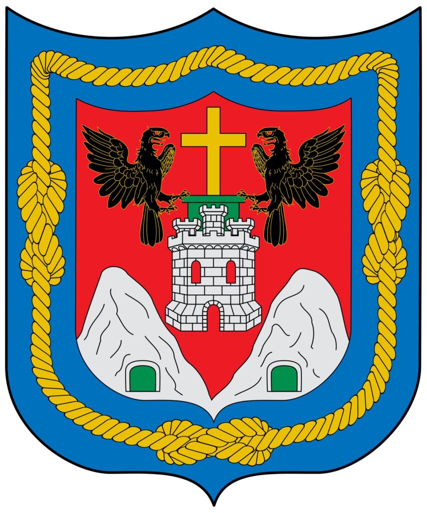 Castillo de plata metido entre dos cerros, con una cava verde al pie de cada uno de ellos, y asimismo encima de dicho castillo una cruz de oro con pie verde que la tengan en las manos dos águilas negras grietadas de oro, a los costados, puestas en vuelo, todo en campo de colorado