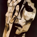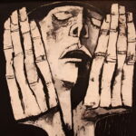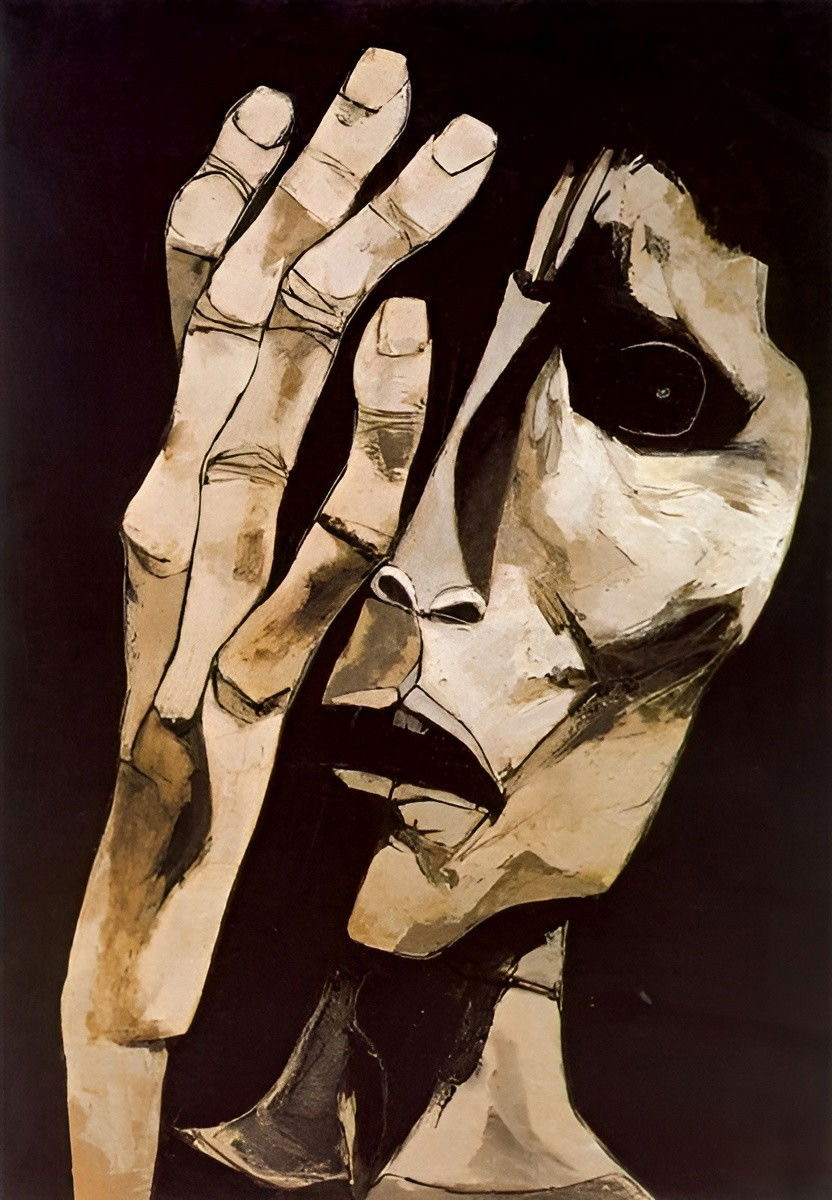 Así, se muestra un rostro alargado y fragmentado con una mano en primer plano, cubriendo parcialmente el rostro. Este es un recurso típico de Guayasamín para amplificar la intensidad emocional. La expresión del personaje es desgarradora, con una boca entreabierta y ojos profundamente oscuros que transmiten angustia e impotencia.
