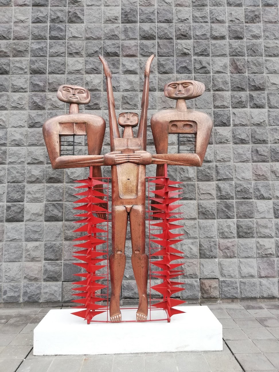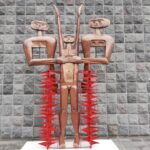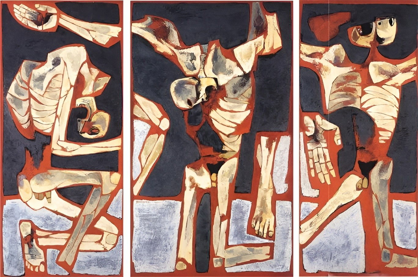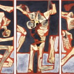 Las figuras aparecen fragmentadas y contorsionadas, como si estuvieran atrapadas en un estado perpetuo de sacrificio. Los cuerpos esqueléticos y desmembrados transmiten un fuerte sentido de fragilidad. Asimismo, las proporciones exageradas y los trazos angulosos refuerzan la intensidad emocional.
