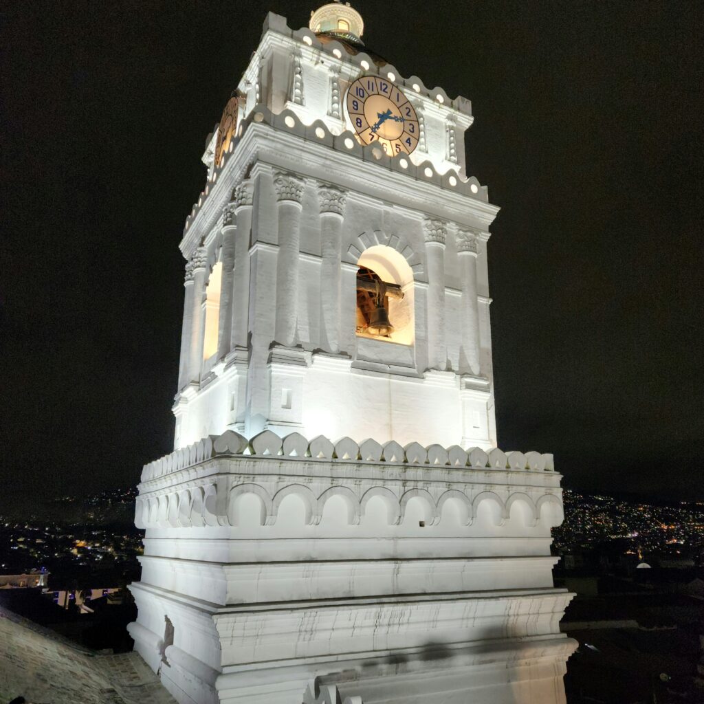 Inside, the elliptical dome of the presbytery and the transept display architectural solutions that were restored after the damage caused by earthquakes, particularly the one in 1869, which required reinforcing its drum. The tower, the tallest in the Historic Center, is composed of three sections: a first cubic level with moldings and barbicans, a bell tower with four arches and enormous bells—one of the largest in America—and a third level with a London clock installed in 1820, culminating in a ribbed dome with a lantern and a capulin.