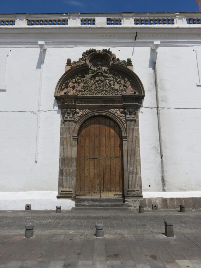On the main façade, at the entrance, we see two stone portals from the Monastery of Santa Clara in Quito. The first on the south side features a representation of Saint Clare of Assisi and a monstrance, with Saint Francis and Saint Dominic, with angels and Saint Michael the Archangel; the second gate on the north side features a representation of the Coronation of the Virgin Mary alongside the Holy Trinity surrounded by angels and cherubs.