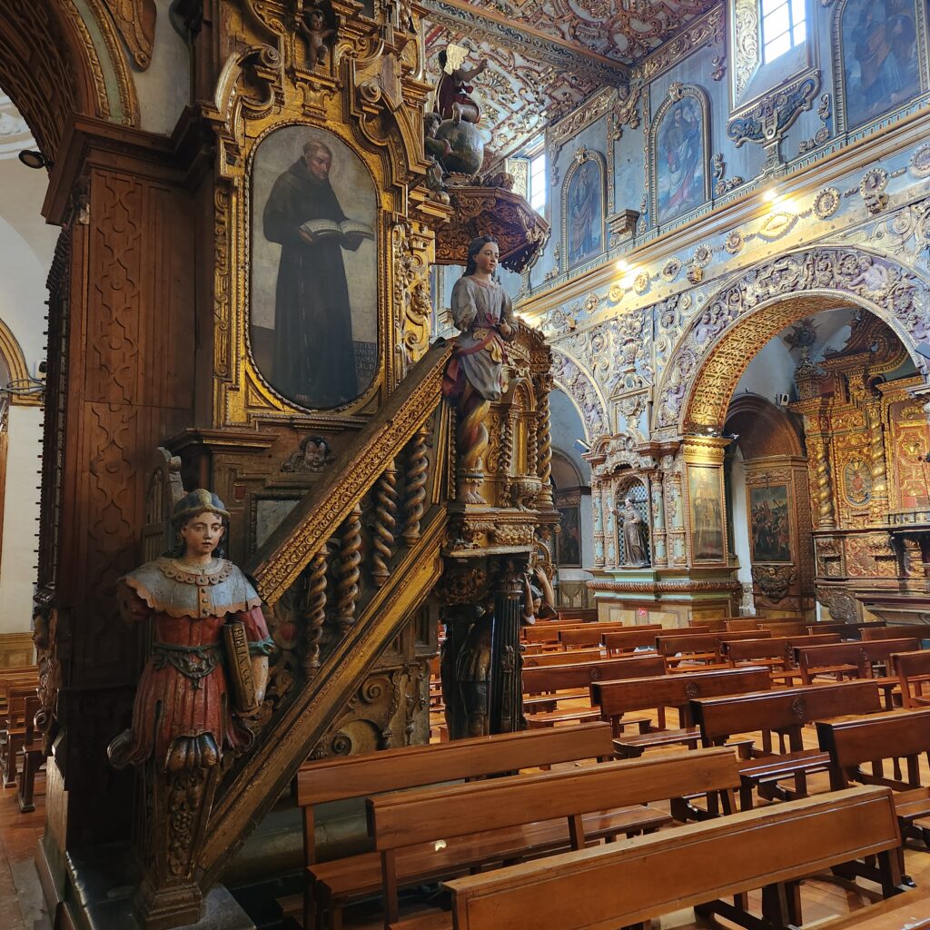 Overall, the interior combines Mudejar, Mannerist, and Baroque styles in a striking unity. The gilded coffered ceilings, polychrome reliefs with American plant motifs, and Plateresque side altarpieces demonstrate the fusion of artistic influences. The choir stalls, with their star-shaped Mudejar coffered ceiling and 75 cedar stalls, were the center of Franciscan liturgical music. With more than 3,500 works of art, the Church of San Francisco constitutes one of the most complete and representative collections of the Quito School, a space where architecture, sculpture, and painting are integrated into a unique experience of spirituality and art.