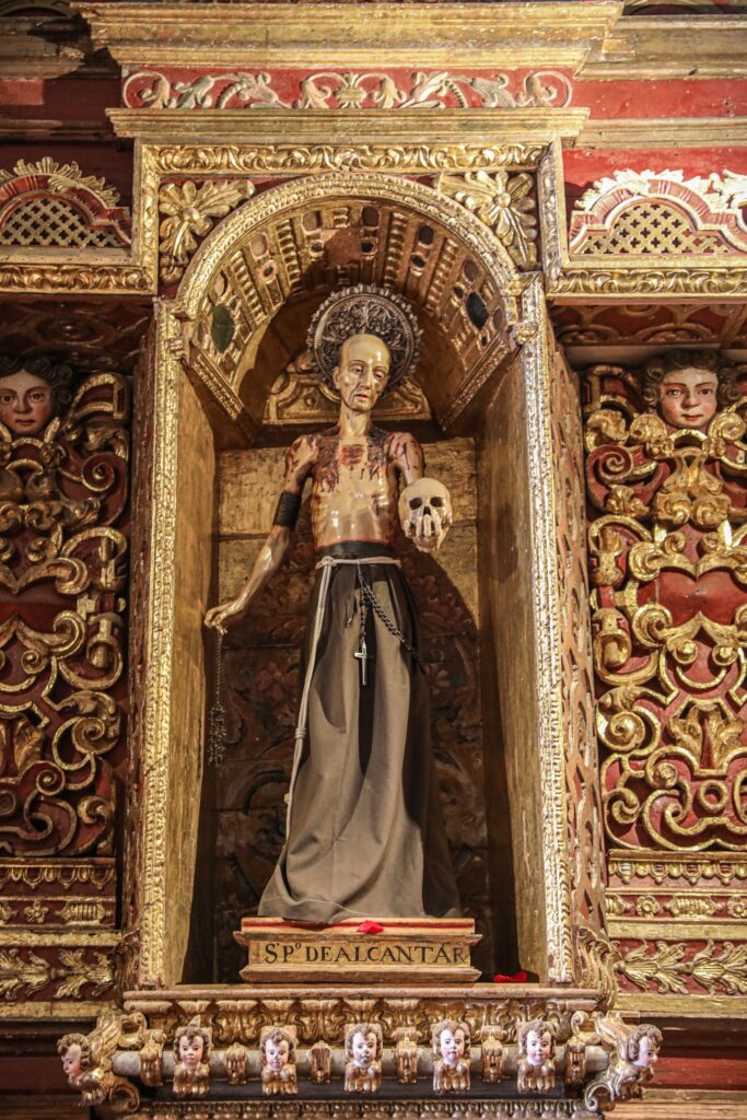 On the Epistle side of the Chapel is Saint Peter of Alcántara, a Spanish Franciscan friar. His real name was Juan de Garavito y Vilela de Sanabria. He died at the age of 63. He was beatified by Pope Gregory XV in 1622 and canonized by Clement IX in 1669. On the same side, we find an altarpiece with the relief of the «Impression of the Wounds of Saint Francis,» attributed to Manuel Chili Caspicara. This artistic composition has its controversies due to the magnificent carving of the saint of Assisi and the simple carving of the angels accompanying him. At the bottom of the altarpiece of Saint Francis are inscriptions that emphasize the following: «This chapel was commissioned by Francisco de Cantuña»; «This chapel was completed on November 22, 1669»; and another in Latin, «Hoc est enim corpvs mevm…..»