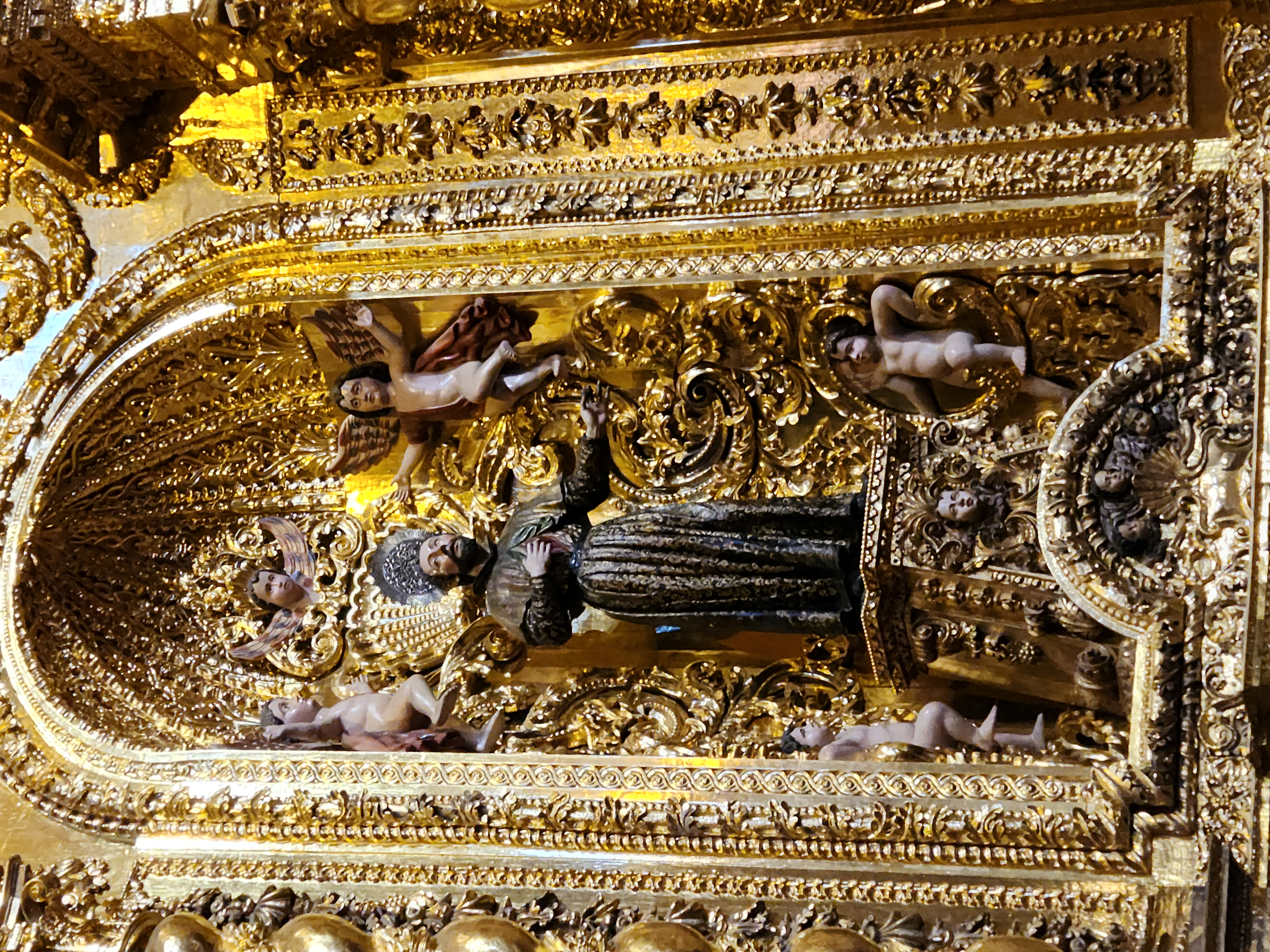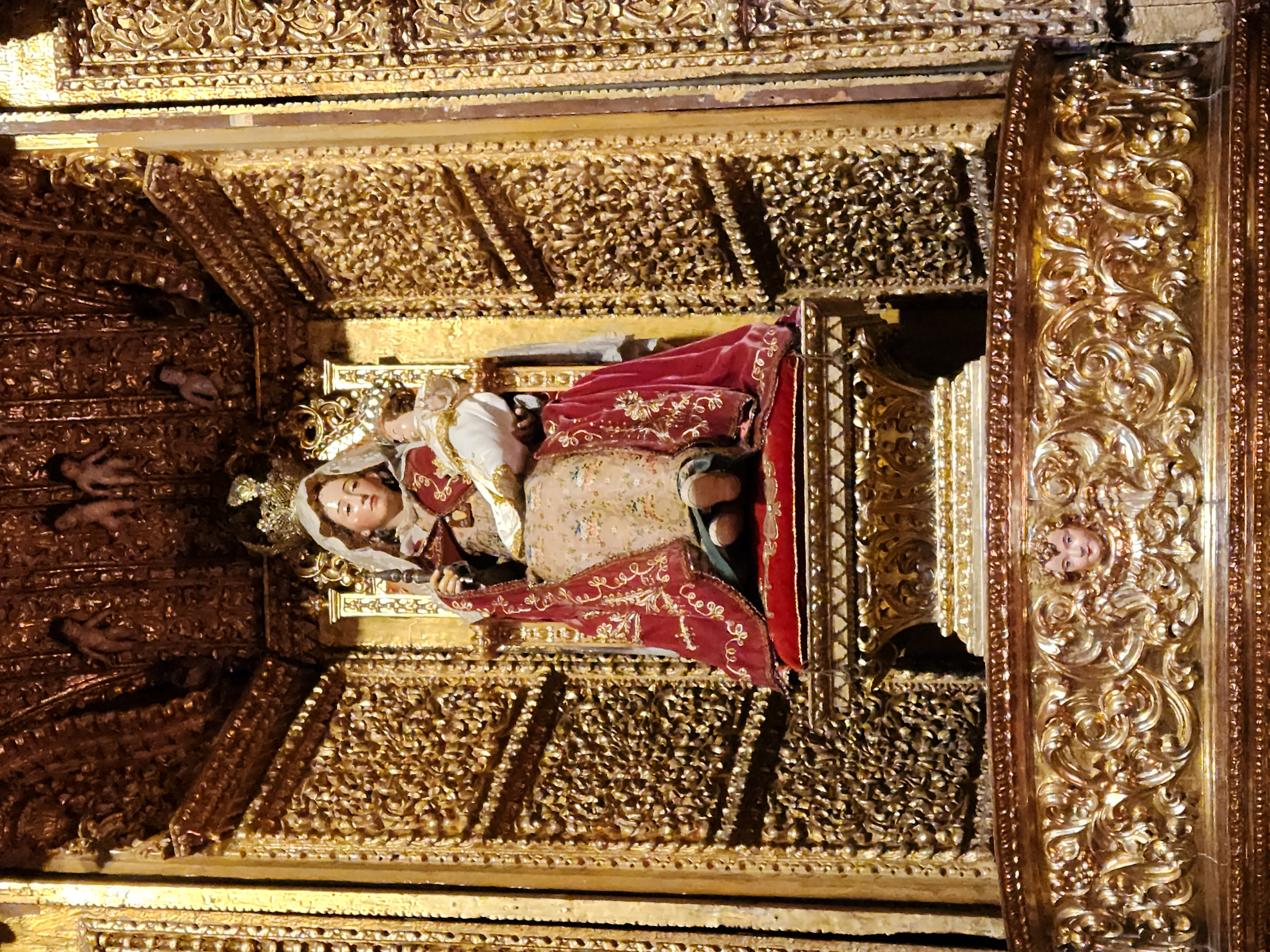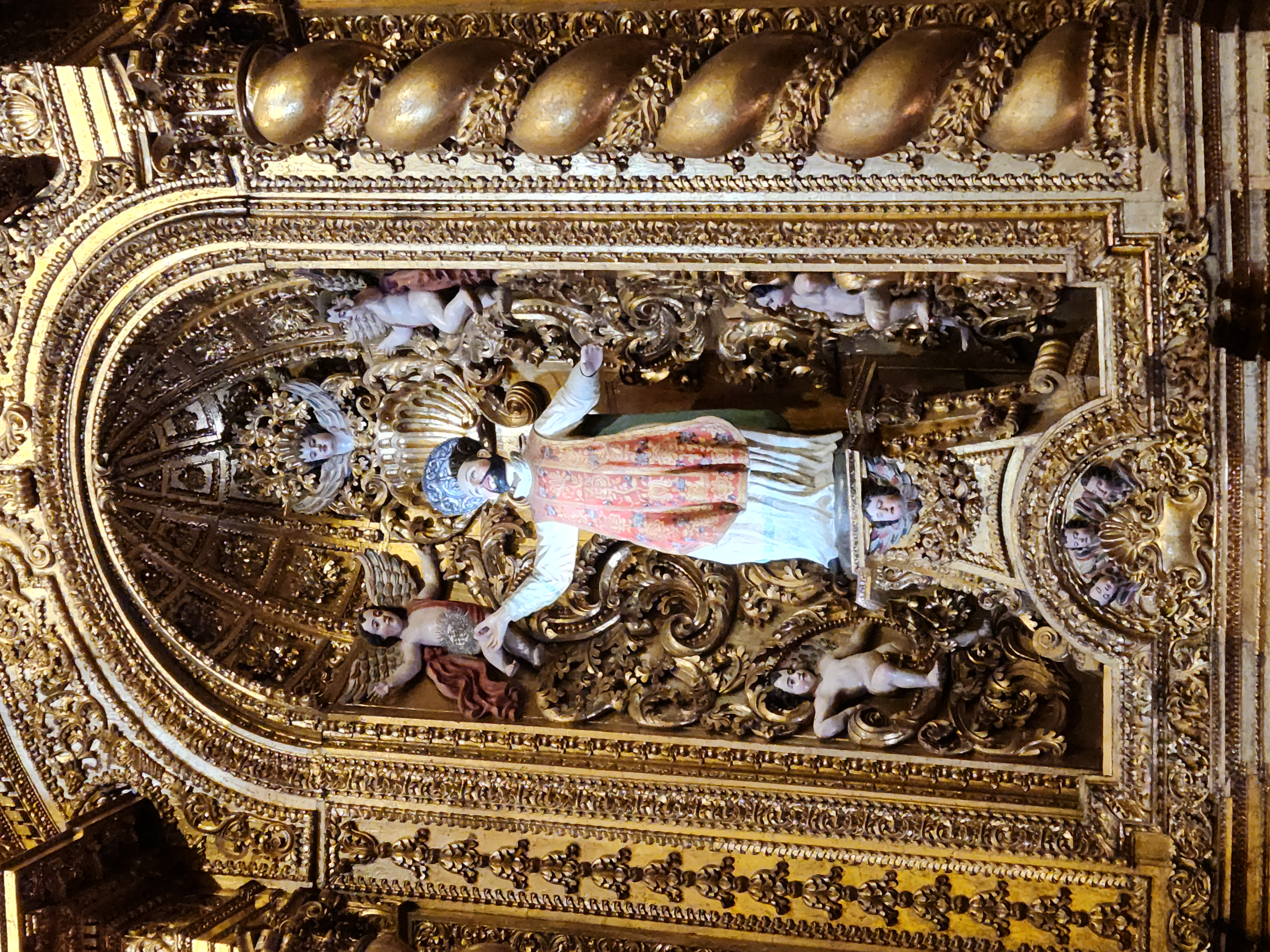 Las columnas salomónicas, de la mampara están preciosamente decoradas, fondo color rojo y doradas