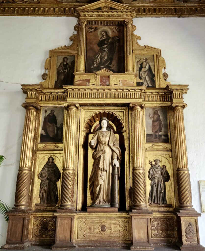On the lower floor, the corners of the cloister house Mannerist altarpieces with polychrome sculptures of saints such as Barbara, Margaret, Catherine, and Lucia. Of particular note is the carving of Catherine of Alexandria (1667), a work by the sculptor Juan Bautista Vásquez, made of European cedar and linked to the memory of the Atahualpa family.