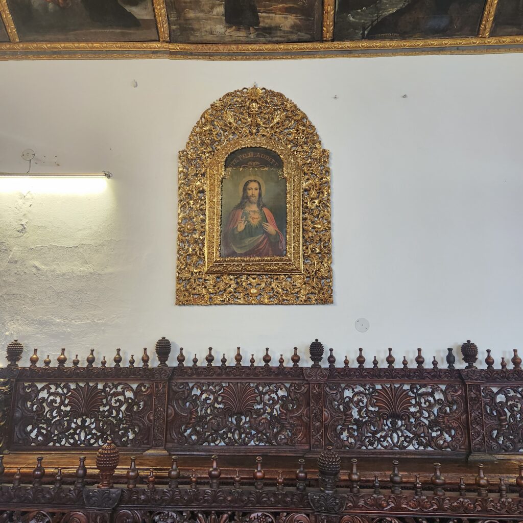 El espacio, de grandes dimensiones, destaca por su riqueza artística: un artesonado con diseños geométricos, lienzos religiosos, sillería y tribuna talladas en madera con pan de oro. En el extremo opuesto, un retablo barroco churrigueresco alberga la escultura del Calvario, obra del maestro José Olmos “Pampite”. Todo el conjunto combina arte, historia y espiritualidad, convirtiendo a la sala en un símbolo cultural y patrimonial de Quito.